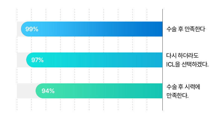 In a survey of 3,500 patients conducted by STAAR Surgical, the manufacturer of EVO+ICL, 99% responded that they were satisfied with the surgery, 97% responded that they would choose EVO+ICL if they had the surgery again, and 94% responded that they were satisfied with their vision after the surgery.