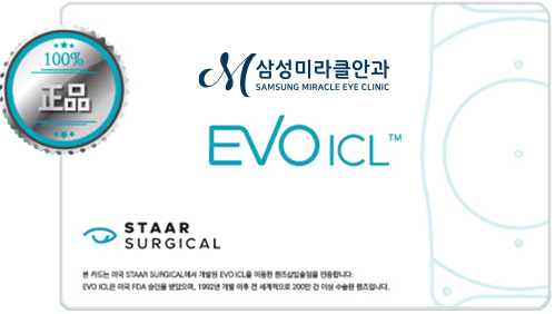 Samsung Miracle Eye Clinic issues an EVO+ ICL Certification Card to all patients undergoing intraocular lens implantation (ICL) surgery, certifying the procedure as genuine. This card certifies that the procedure was performed using the genuine EVO ICL, developed by STAAR SURGICAL in the United States.